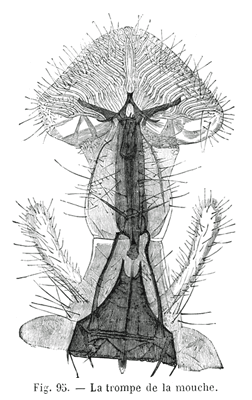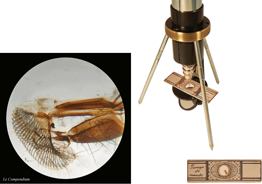 L'oculaire n°3 et l'objectif formé de trois lentilles sur montures indépendantes offrent des grossissements qui varient entre 20 et 150 fois. La photographie de la trompe de mouche, objet de la petite préparation ancienne, a été réalisée à travers notre microscope "Junior" en choisissant un grossissement intermédiaire. |