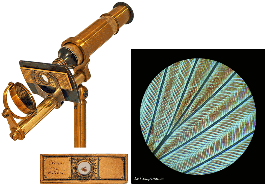 Un second exemplaire du microscope est parvenu jusqu'au Compendium. La lyre qui maintient la préparation plaquée contre la face inférieure de la platine du premier spécimen a disparu. Deux valets, cette fois-ci fixés sur la face supérieure de la platine, la remplacent en rendant le positionnement de la préparation plus aisé. |