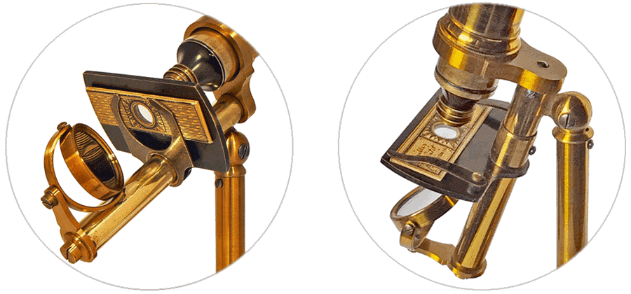 L'instrument présente une particularité visible sur l'image de gauche : la lyre, destinée à mantenir la préparation, est placée contre la face inférieure de la platine. |