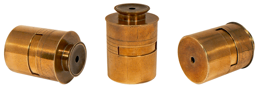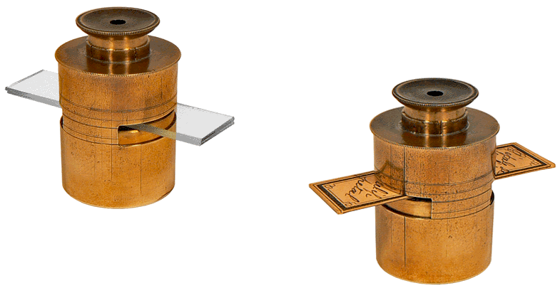 Pour observer une préparation, il faut l'introduire dans le corps du microscope en abaissant une platine cylindrique interne qu'un ressort tend à repousser vers l'œilleton. La mise au point s'effectue ensuite par tirage de cet œilleton qui porte le système de lentilles. On peut regretter que rien ne facilite l'opération de mise en place et de retrait de la lame comme c'est le cas sur d'autres modèles. Les photographies qui suivent montrent deux autres instruments possédant le même dispositif à ressort : ils offrent, pour simplifier la manipulation, soit deux larges ouvertures ménagées sur le corps du microscope, soit deux ergots solidaires de la platine interne. Il est ainsi possible d'abaisser la platine mobile d'une main, d'introduire la préparation de l'autre main puis de relacher doucement la pression sur la platine jusqu'au blocage. |
