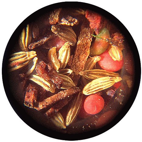 Nous observons un mélange de graines officinales. Le microscope peut être pris en main par son étui sans que l'éclairage latéral des objets placés à l'intérieur de la cage en verre ne soit perturbé. |