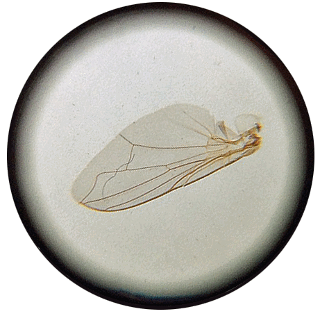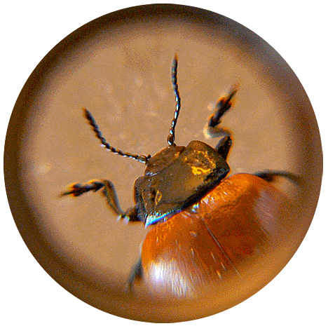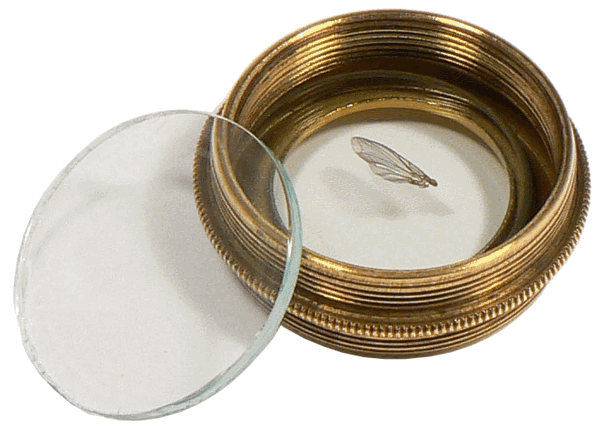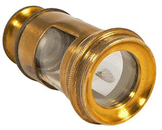Arthur CHEVALIER fait référence au modèle le plus complet de microscope à graines, modèle pour lequel le dispositif de présentation de l'objet à observer est constitué par un cylindre dont le fond est formé de deux disques en verre transparent en contact l'un de l'autre : c'est ce modèle que nous avons utilisé pour étudier l'aile de mouche. Quelquefois l'instrument est simplifié, l'objet à examiner étant placé dans une simple cuve cylindrique en verre épais et à fond plat : c'est le cas, ci-dessous, pour notre petit coléoptère. Lorsque cette cuve possède un fond dépoli, ce dernier diffuse bien la lumière. En revanche, le système n'est pas approprié pour l'observation d'un objet transparent qu'il est préférable de disposer entre deux verres et que l'on observe en dirigeant le microscope vers une source de lumière, sans le monter sur son étui. |