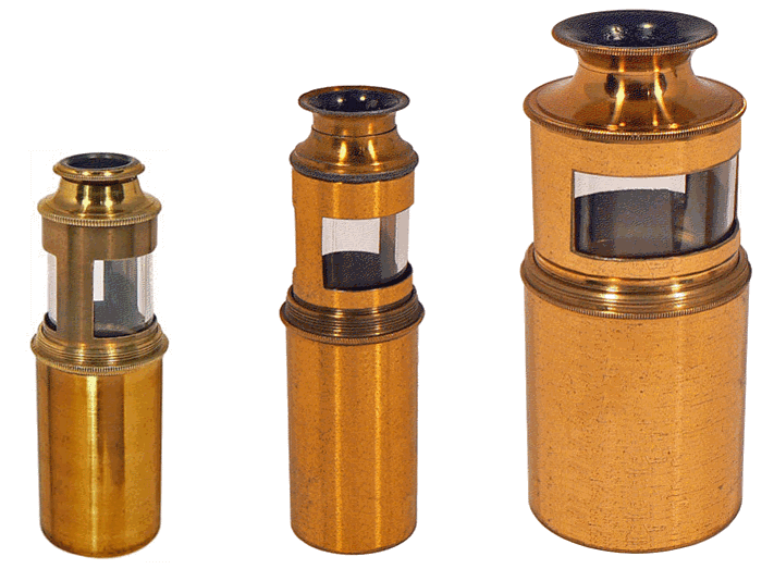 Trois microscopes à graines dont la hauteur varie entre 8,5 et 12 cm. Le modèle de droite est beaucoup plus gros avec un diamètre de 4,5 cm. |