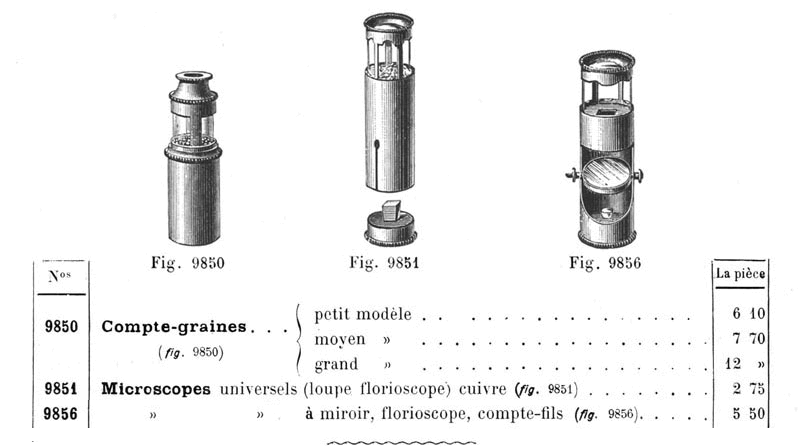 A la fin du XIXe siècle, la SOCIÉTÉ DES LUNETIERS présente le "compte-graines" à côté de microscopes de poche ou floroscopes, munis, en plus de la lentille biconvexe classique, d'une lentille de Stanhope permettant le fort grossissement d'objets transparents. Ces petits instruments aux multiples variantes et appellations sont très présents dans le Compendium... |