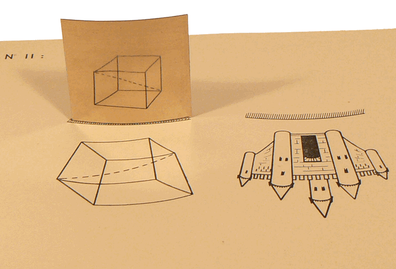 L'image du cube déformé est regardée dans le miroir cylindrique convexe qui rétablit la forme "normale". Ces anamorphoses, obtenues à partir de dessins quelquefois incompréhensibles en l'absence du miroir, étaient très en vogue durant le 18e siècle. |
