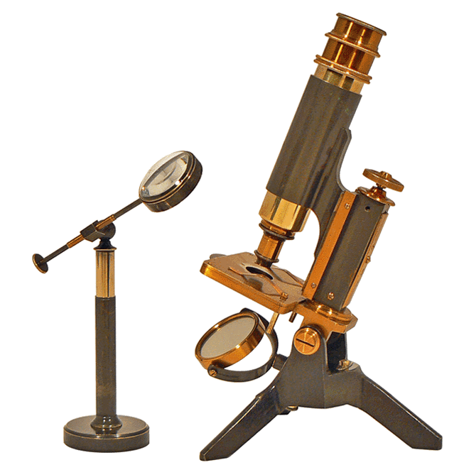 Microscope d'étude et sa loupe sur pied pour l'éclarage des objets opaques - hauteur minimum 26 cm - Royaume Uni - Vers 1890 |