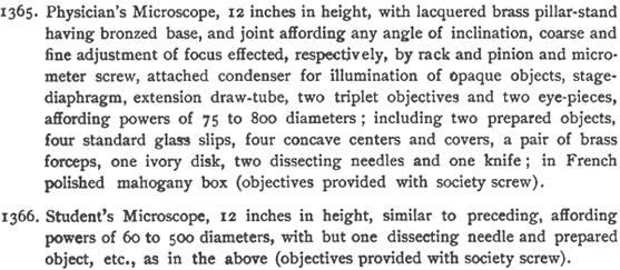 Le microscope, de fabrication française, est proposé par différentes maisons spécialisées dans le matériel scientifique. On le rencontre sous différentes tailles et finition. A New York et vers la fin du 19e siècle, B. KAHN & SON, fabricant et importateur, présente deux versions de l'appareil sous les appellations "Physician's Microscope" et "Student's Microscope". Selon la version, l'instrument coûte 60 et 50 $. Le modèle que nous présentons, probablement le plus grand, ne possède pas le réglage grossier par crémaillère mais uniquement le réglage fin par vis micrométrique. Tous ses constituants sont marqués du chiffre 1 ... |
