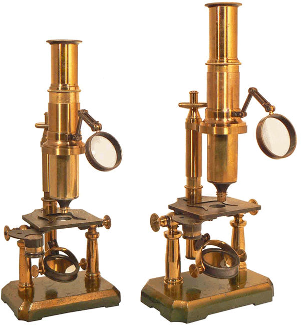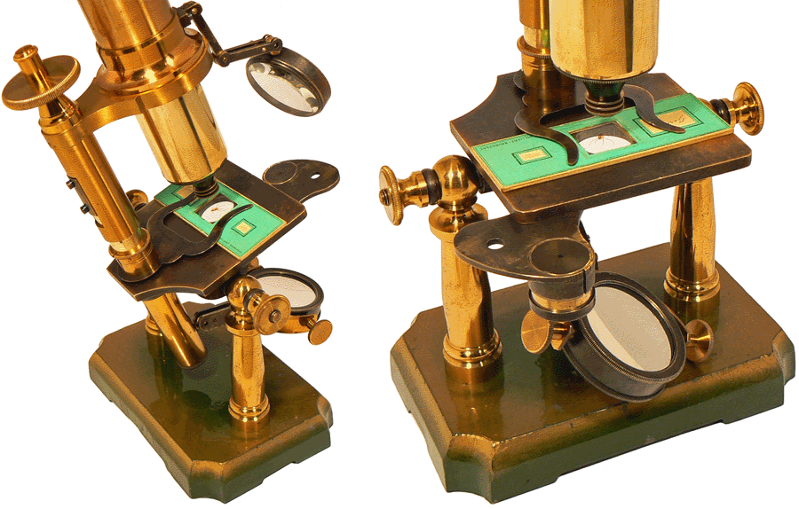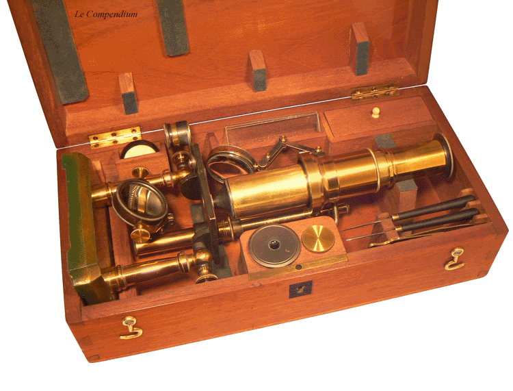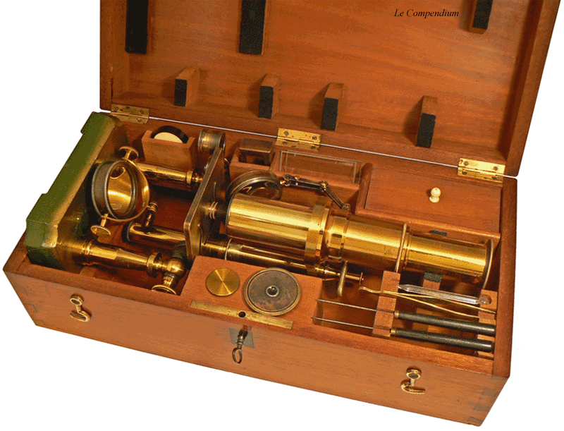 Un second microscope, semblable, est rangé dans le Compendium. Sur la photographie qui suit, il est à gauche. Sa construction est identique à celle de son voisin mais les composants sont plus petits, exceptés l'objectif et le diaphragme tubulaire qui peuvent passer de l'un à l'autre. En revanche, les oculaires, dont les diamètres diffèrent, ne sont pas interchangeables ... |
