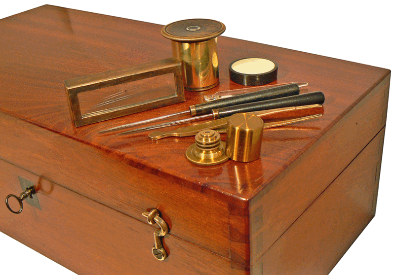 Les accessoires qui accompagnent le microscope sont posés sur le coffret en acajou. Au premier plan, un objectif supplémentaire et son étui de protection. A la suite, la pince, deux aiguilles montées et un petit agitateur-spatule en verre. Au fond et à gauche, une cuve d'observation rectangulaire. A droite de la cuve, un deuxième oculaire et enfin le disque ou la "dame" en ébène et ivoire. Il ne manque qu'un petit scalpel pour que l'équipement soit complet ... |