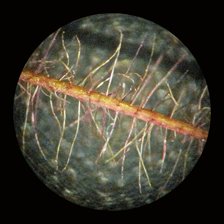 Pour l'observation de certains objets opaques à l'état ordinaire, comme ici les inflorescences de Cotinus Coggygria (l'Arbre à perruque), on dispose d'une "dame" de 31 mm de diamètre, en ébène et dont l'une des faces est incrustée d'un disque d'ivoire. En choisissant l'une ou l'autre des faces, on utilise un fond foncé ou clair qui tranche avec la couleur de l'objet observé et permet d'obtenir des images très différentes ... |