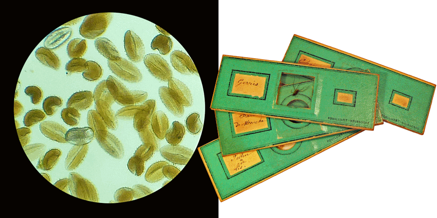 Quelques lames porte-objet rodées et vierges ainsi que des préparations accompagnent le microscope. Cheveux Divers, Patte de Mouche, Gerris (ou Araignée d'eau) et Pollen de Lis sont signées POUILLIART - BOURGOGNE (vers 1875). Leurs grandes dimensions, 79 x 29 mm, sont inhabituelles et elles ne trouvent pas leur place dans les boites de préparations classiques ... Dessous, c'est la lame de Pollen de Lis qui est photographiée à travers l'optique de notre microscope. |