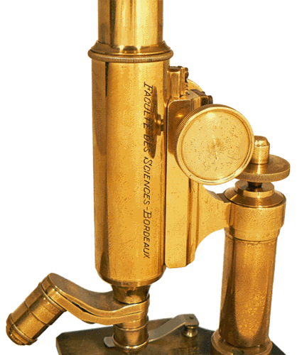 Notre exemplaire porte, sur un côté du tube optique, la marque du fabricant et sur l'autre côté le nom de l'établissement propriétaire, "FACULTÉ DES SCIENCES - BORDEAUX". Le "4" gravé au bas de la colonne correspond au numéro d'inventaire du laboratoire où l'instrument était utilisé. |