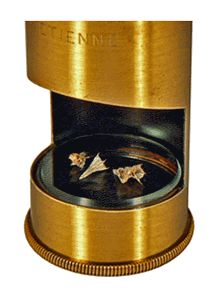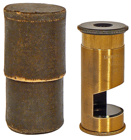 Près de son étui en carton recouvert de tissu, le microscope de poche - Hauteur minimum 5,5 cm - Vers 1930 |