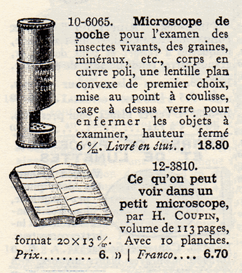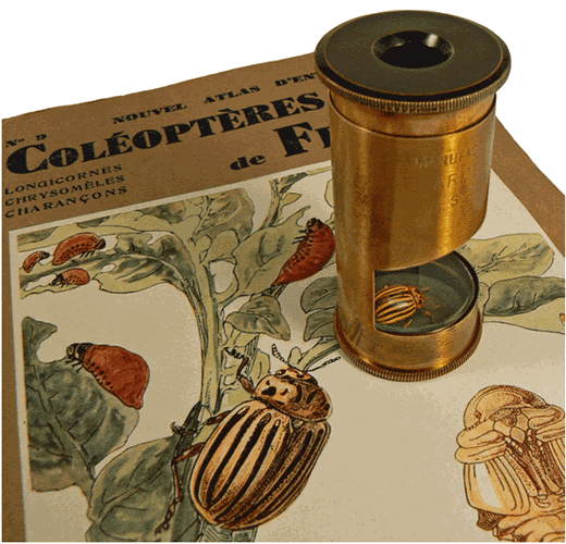 Le petit microscope est posé sur la couverture du tome III du Nouvel Atlas d'Entomologie consacré aux Coléoptères de France, paru chez N. Boubée en 1947. |