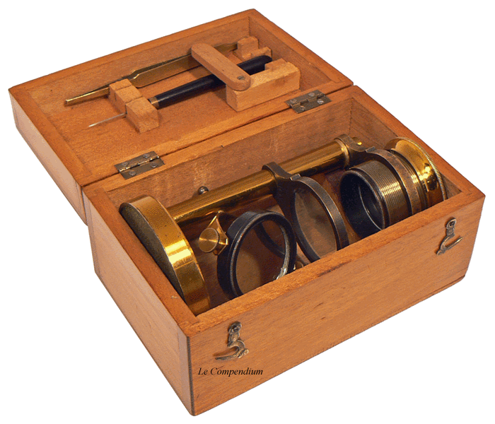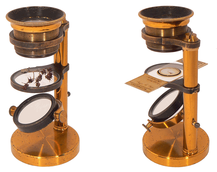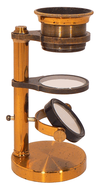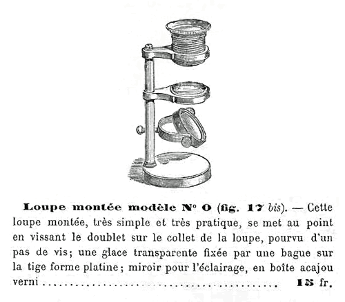 Ce microscope simple est proposé par LES FILS D'EMILE DEYROLLE en 1900 dans le "Catalogue de Micrographie". Il figure toujours dans les catalogues "Microscopes" de 1923 et "Instruments pour l'étude pratique des sciences naturelles" de 1924. Utilisé dans de nombreux domaines, on le retrouve à la même époque chez DUJARDIN-SALLERON "pour examiner facilement les maladies et parasites de la vigne, sur les raisins, sur les ceps, les feuilles, les racines, les écorces, etc.". L'objet à observer étant placé sur la platine circulaire en verre, la mise au point s'effectue en tournant la monture à vis portant un doublet optique. Ce doublet, constitué par deux lentilles biconvexes de plus de 3 cm de diamètre, offre un bon champ de vision. Le foyer est assez long ce qui autorise les travaux de dissection. Le miroir orientable permet d'éclairer la préparation. La hauteur du microscope est de 12 cm. |