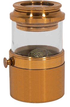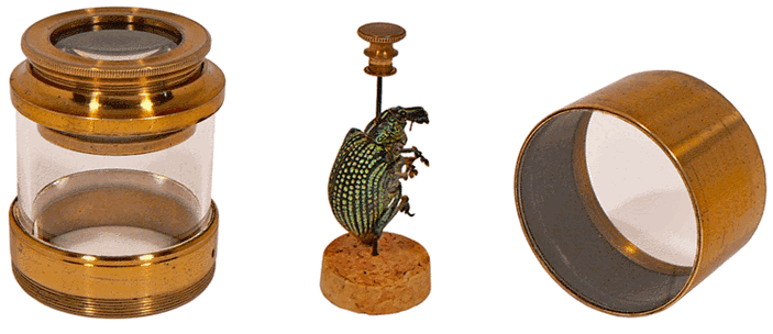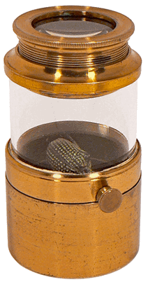 Le fond vitré remis en place, il suffit de tourner le petit bouton extérieur pour observer l'insecte de tous côtés. L'optique consiste en un doublet formé par deux lentilles plan-convexes de 3 cm de diamètre fixées dans une monture à vis permettant la mise au point. |