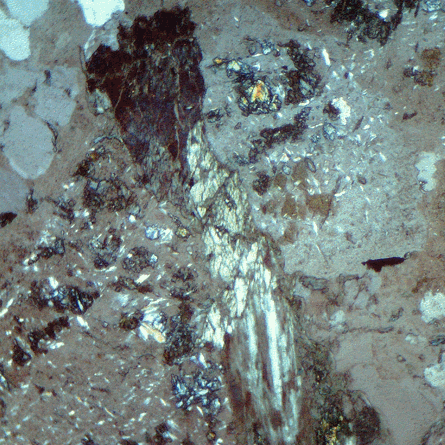 Une lame mince de diorite observée, ci-dessus à gauche, en lumière naturelle et, à droite, en lumière polarisée. Les contrastes et couleurs qui apparaissent en lumière polarisée renseignent le micrographe sur la présence de composants optiquement actifs. Une page du Compendium est consacrée aux lames minces d'Ivan Werlein examinées au microscope polarisant. On y accède directement en cliquant sur le lien au bas de cette page. |
