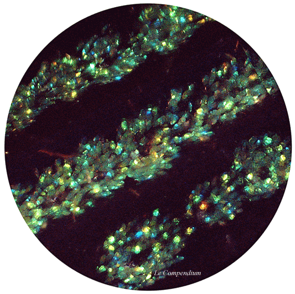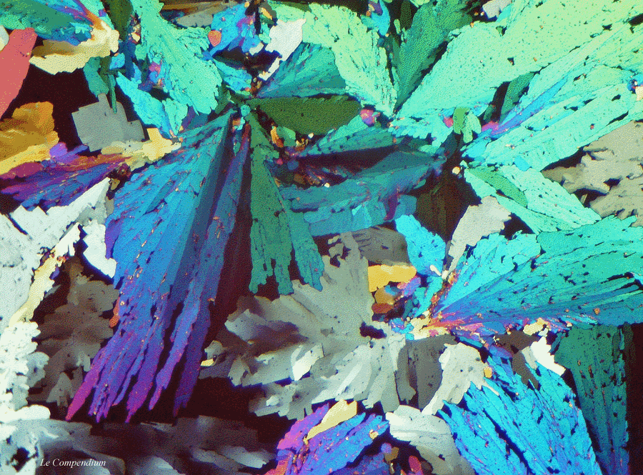 Il s'agit, ici, d'une préparation de coumarine, corps cristallin aromatique. Lorsque l'on regarde la lame à l'oeil nu, on décèle tout juste la présence d'une substance incolore. L'observation au polariscope, terme utilisé par les anglo-saxons pour nommer le microscope utilisant la lumière polarisée (microscope polarisant), met en évidence des zones bien distinctes sur toute la surface de la préparation. |