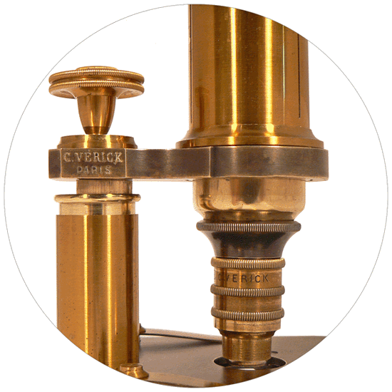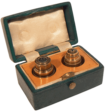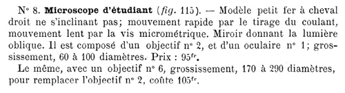L'écrin renferme deux objectifs n° 2 et n° 6. Combinés aux oculaires 1 et 4, présents dans le coffret du microscope, il est possible d'obtenir des grossissements qui varient entre 60 et 650 fois. Sur le tableau, tiré du Traité de E.Trutat et donnant les "renseignements nécessaires sur la puissance des objectifs de monsieur Vérick", les faibles grossissements (à gauche dans chaque colonne) s'obtiennent à l'aide du corps du microscope raccourci, et le chiffre plus élevé (à droite dans une même colonne) avec le corps complètement tiré. |