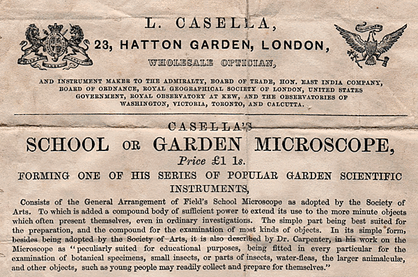 Cet instrument, que l'on pouvait se procurer vers 1870 pour la somme de 1 livre et 1 shilling, est conforme aux recommandations de la "Society of Arts" de Londres, qui encourageait la construction de microscopes de bonne qualité destinés aux étudiants et proposés à un prix raisonnable. En 1855, au moment de l'Exposition Universelle de Paris, le "Society of Arts Prize Microscopes" a été décerné à un constructeur de Birmingham, "Robert Field & Son", spécialisé dans les instruments d'optique et de mathématiques. Quelques années plus tard, L. Casella s'est inspiré du Field's School Microscope pour construire le Casella's School or Garden Microscope en lui ajoutant les fonctionnalités du microscope composé. |