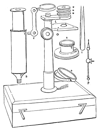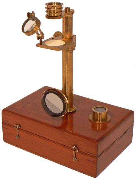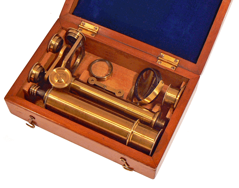 Les éléments, proposés dans un petit coffret en acajou de 15,5 x 11 x 5,2 cm, permettent de mettre en œuvre, soit un microscope simple destiné aux observations courantes de botanique ou d'entomologie, soit un microscope composé permettant un grossissement plus élevé. L'éclairage est assuré par un miroir à deux faces, l'une concave et l'autre diffusante, et par une loupe articulée permettant d'éclairer les objets opaques. La platine du microscope reçoit un disque en verre pour l'éclairage par transparence ou un disque en ivoire faisant office de fond blanc lors de l'observation d'un corps opaque éclairé par le dessus. |