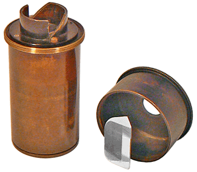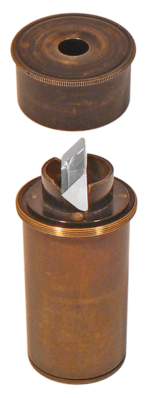 Il s'agit d'un oculaire de Huygens classique au dessus duquel est positionné un prisme rectangle isocèle dont la face hypoténuse reste parallèle à l'axe optique. Les rayons lumineux qui entrent par l'une des faces de l'angle droit ressortent par l'autre face en donnant d'un objet une image symétrique par rapport à la face hypoténuse verticale |