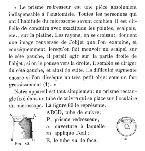 Dans son ouvrage L'ETUDIANT MICROGRAPHE (édition de 1882), Arthur CHEVALIER recommande cet accessoire lors des dissections sous l'objectif du microscope horizontal : |