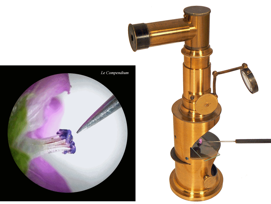 Nous utilisons ici le "microscope achromatique simplifié" construit par LEREBOURS vers 1850, dans sa version horizontale, c'est-à-dire muni d'un renvoi à angle droit par prisme à reflexion totale. Notre oculaire à prisme redresseur a remplacé l'oculaire classique. Les deux prismes, celui du renvoi coudé et celui de l'oculaire sont croisés c'est-à-dire que leurs arêtes sont horizontales pour le premier et verticales pour le second. A travers l'instrument ainsi équipé, les déplacements de l'extrémité de "l'aiguille montée", qui est sur le point de toucher le groupe d'étamines d'une fleur, sont suivis comme à l'œil nu. Sur la photographie du microscope, la pointe métallique est - pour un observateur placé correctement - en haut et à droite de la platine c'est-à-dire dans le premier quadrant. Il en est de même de l'image vue à travers le microscope. |