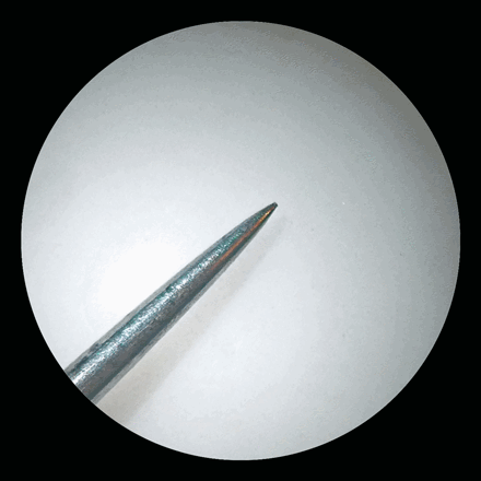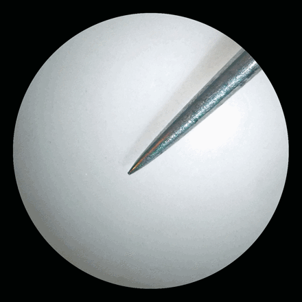 L'aiguille montée du manipulateur étant maintenue comme précédemment, la microphotographie ci-dessous à gauche et son image symétrique par rapport à l'axe optique du microscope, à droite, illustrent le champ de vision obtenu, d'une part, avec le microscope dans la configuration précédente et d'autre part avec le même instrument utilisé sans le renvoi coudé et sans l'oculaire redresseur c'est-à-dire dans la configuration de microscope ordinaire vertical. |
