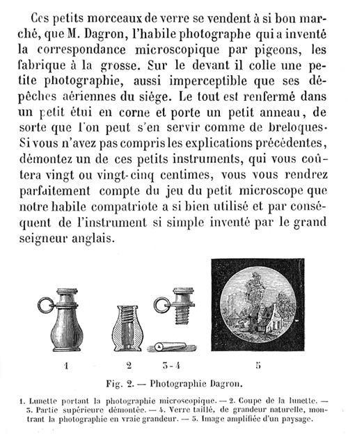 Il convient de rappeler que René Dagron s'est surtout illustré pendant le siège de Paris de 1870 par la réalisation de correspondances et de dépèches microscopiques qu'un pigeon pouvait emporter sous son aile ... Les dépèches, échangées entre grandes villes étaient lues grace au "microscope photo-électrique" de Dubosq. |