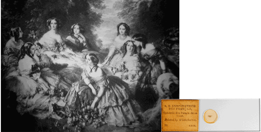 Cette représentation de l'Impératrice Eugénie entourée des Dames de sa Cour est une reproduction en noir et blanc de l'œuvre du peintre allemand Winterhalter. Elle est obtenue, ici, à partir d'une microphotographie réalisée par John Benjamin Dancer dans la deuxième partie du XIXe siècle. Sur la lame proposée par Dancer, le tableau de 4,20 m de large occupe un rectangle dont la longueur est voisine de 2mm. C'est cette préparation, d'une qualité exceptionnelle, que nous avons photographiée à travers un microscope "actuel" pour obtenir notre image.