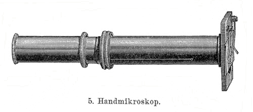 Ce microscope composé, dont le tube optique de 11 centimètres est identique à celui des petits microscopes à niche typiquement français, ne possède ni statif ni miroir. On l'utilise, à la manière des microscopes de poche, en le tenant à la main. La préparation est maintenue contre la platine, pressée par une lame métallique élastique, fine et évidée, qui joue le rôle des valets d'un microscope classique. La mise au point est réalisée par glissement du tube optique dans un manchon cylindrique solidaire de la platine. |