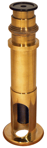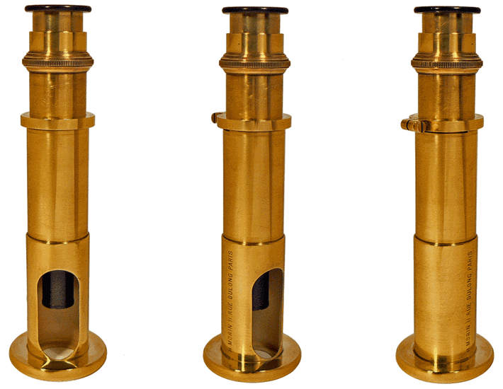 Le corps du microscope est muni d'une semelle plane parfaitement dressée, présentant une ouverture pour visualiser la zone de mesure. Une fenêtre latérale permet l'éclairement de cette zone, la lumière étant diffusée par la paroi intérieure laquée en blanc. Le tube optique comporte un objectif achromatique - délimité par le tube métallique noir - et un doublet de Ramsden qui joue à la fois son rôle d'oculaire dans le fonctionnement globale du microscope et le rôle de loupe permettant d'observer les graduations d'une échelle micrométrique placée à environ 1 cm, au voisinage de son foyer. |