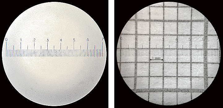 A gauche, on observe l'échelle micrométrique, intégrée au microscope, à travers l'oculaire. Pour celà, le microscope est posé sur du papier blanc correctement éclairé. A droite, la semelle du microscope est posée sur du papier millimétré. L'échelle micrométrique, qui se superpose à l'image du papier millimétré, comporte 70 divisions équidistantes, repérées de 0 à 7 toutes les 10 divisions. 10 petites divisions correspondent à 1 mm sur le papier millimétré donc dans le plan de la semelle du microscope. |