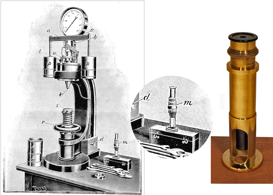 Dans son numéro du 3 octobre 1908, l'hebdomadaire LA NATURE, "Revue des Sciences et de leurs applications aux arts et à l'industrie", décrit un des premiers appareils d'essai à bille Brinell. Sur le dessin de Poyet, le petit microscope m, posé sur son coffret à côté de l'appareil, joue le même rôle que le modèle présenté sur notre page. On accède à l'article de LA NATURE en cliquant sur l'image. |