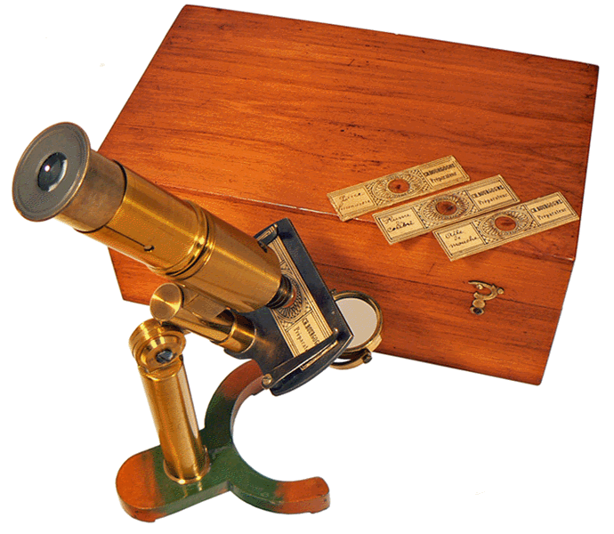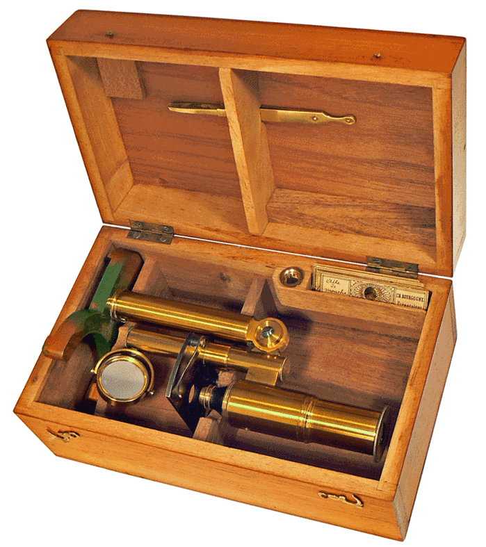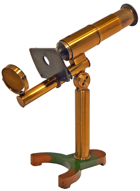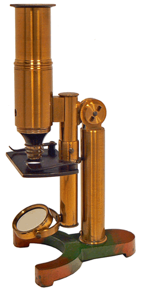 Le microscope ne porte aucun nom de constructeur. Il est semblable à l'un des modèles proposés vers 1880 par McAllister sous le nom "universal microscope" : non seulement la partie optique est identique mais on retrouve le pied caractéristique en forme de Y. La hauteur minimum de l'appareil est égale à 18 cm et le tube optique offre un tirage permettant de l'amener à 24 cm. Il est doté d'un objectif en trois parties superposables permettant de moduler le grossissement. |