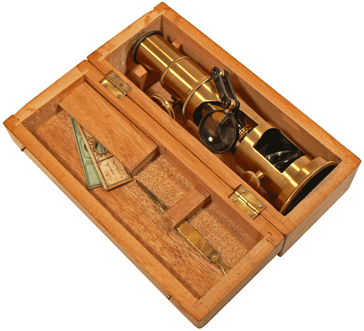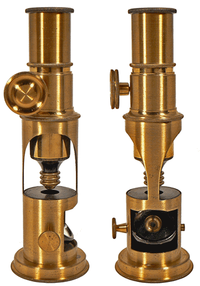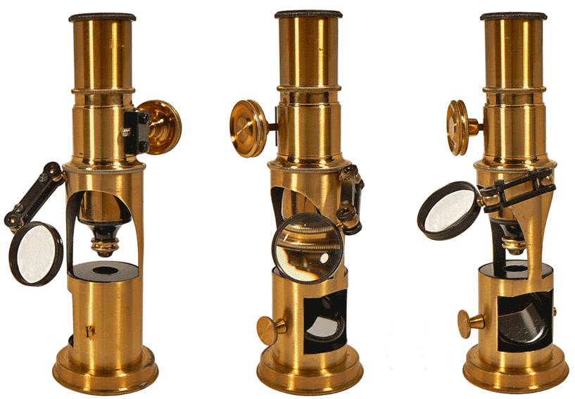 Cet autre instrument, dont la hauteur minimum est également de 15,5 cm, possède une lentille d'éclairement pour l'observation des objets opaques. Il porte le numéro 99. |