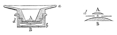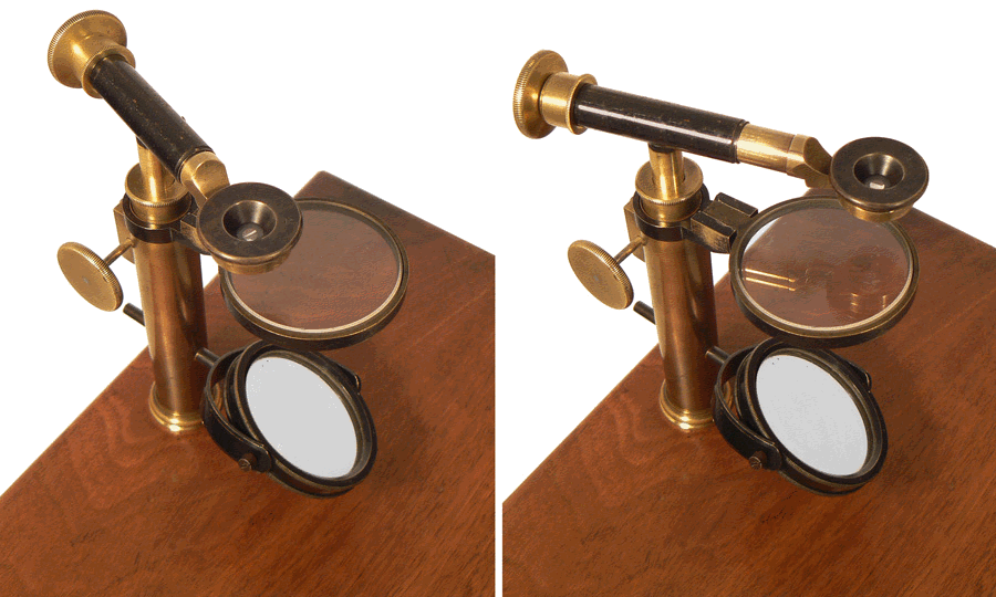 Le microscope utilise des doublets du type Wollaston. Chaque doublet est composé de deux lentilles plan-convexes dont les faces planes sont tournées vers l'objet et séparées par un diaphragme d comme le montrent les coupes empruntées au TRAITÉ DE MICROSCOPIE d'Eugène TRUTAT (1883). |