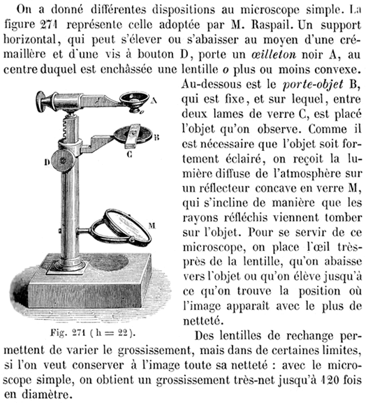 Ci-dessous, dans son TRAITÉ ÉLÉMENTAIRE DE PHYSIQUE (édition de 1855), A. GANOT décrit le microscope simple utilisé par François-Vincent Raspail. A droite, il s'agit du détail d'une représentation de Raspail, visible dans sa totalité au bas de cette page. |