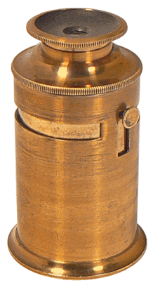 Microscope de poche - Hauteur minimum 6 cm - diamètre du corps cylindrique 3,2 cm - Vers 1870 |