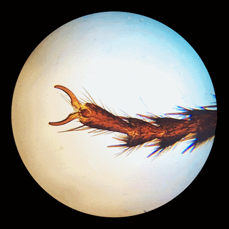 Nous avons photographié, à travers l'optique du microscope, une préparation de patte d'Ocypus Olens, coléoptère noir de la famille des Staphylins, aux élytres très courtes, et que l'on rencontre sous les pierres, sous les écorces et dans les détritus. On le surnomme le diable... La lame, préparée par Joseph Bourgogne micrographe français du milieu du XIXe siècle, accompagnait le microscope à son arrivée dans le Compendium. |