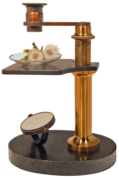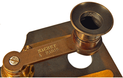 Le modèle a été commercialisé par Nachet pendant plus de 25 ans autour de l'année 1900 et des petites modifications ont été apportées au cours du temps : sur ce deuxième exemplaire, la colonne est en laiton verni. |
