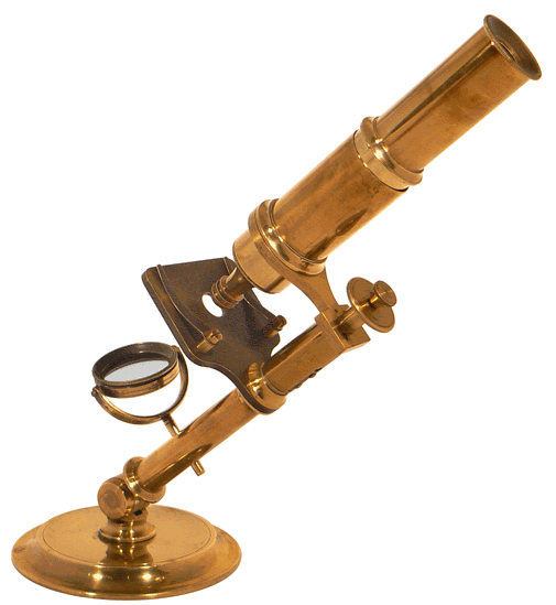 Microscope inclinable sur socle circulaire de 9,5 cm de diamètre - Hauteur minium 26,5 cm - Français, probablement - Vers 1860 |