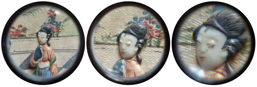 Les lentilles offrent des grossissements différents comme le montre ce détail d'une miniature chinoise, photographié à travers chacune d'elles. |