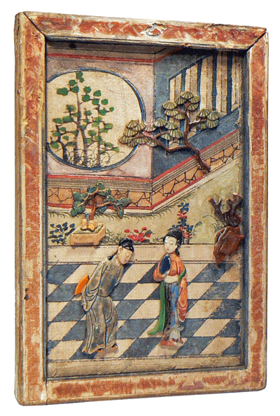 Le modèle a été choisi sur une miniature chinoise du XIXe siècle, en bois, soie et ivoire. L'objet fait partie d'un ensemble de six tableautins de 10,3 par 15 cm dont les faces visibles coulissent en laissant apparaître le dénouement sous un angle plus hardi... |