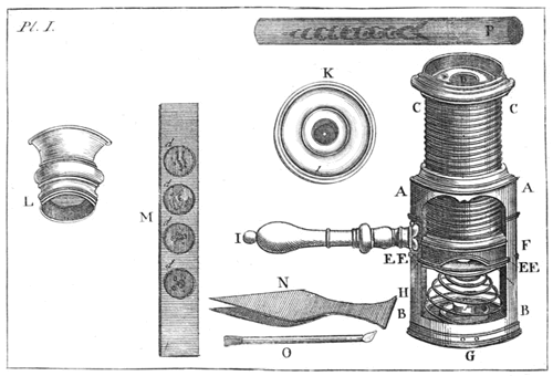 Dans THE MICROSCOPE MADE EASY, Henry BAKER propose une longue description de l'instrument sous le titre "Of Mr Wilson's single pocket microscope". La planche ci-dessus est tirée de la quatrième édition de l'ouvrage, parue en 1754. Au dessus de cette planche, nous avons illustré les extraits du texte d'accompagnement relatifs à la lame (M) et au tube (P) avec deux de nos photographies. |