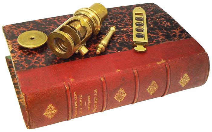 Porte-objets coulissant en laiton, tube en verre, lame en ivoire : pour pouvoir tout observer... |