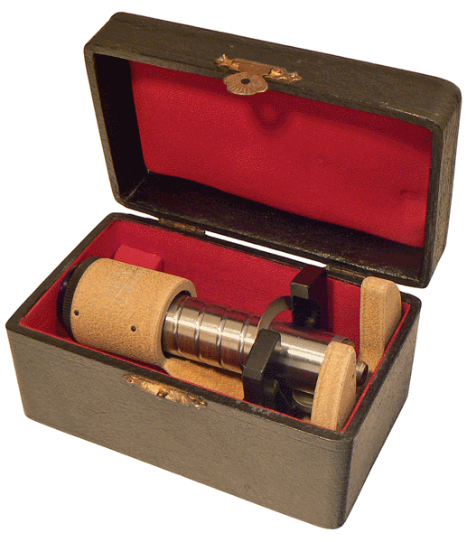 Cette disposition et la possibilité de tirage du tube optique se complètent et offrent deux plages de grossissements de 20 à 50 et de 100 à 200 fois. Sur le tube, certaines valeurs sont repérées par le nombre ou par un point : 20, 30, 40, 50, 100, 150 et 200 fois. |