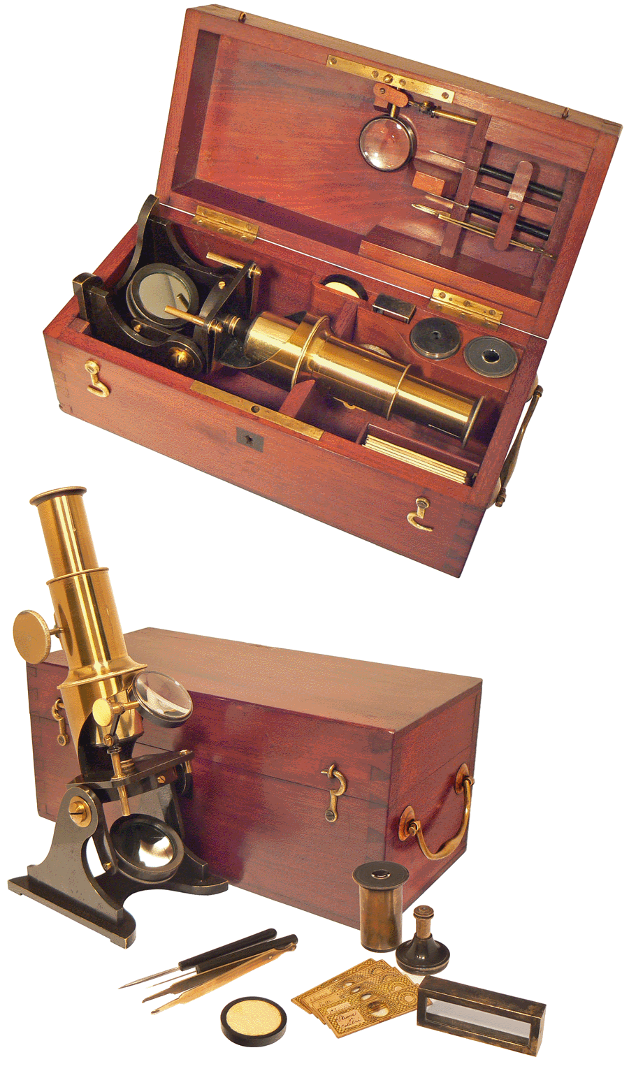 Le coffret de 28 x 13,5 x 12 cm renferme le microscope et ses accessoires. Au premier plan, à gauche des lames préparées par Joseph Bourgogne dans la deuxième partie du XIXe siècle, est posée la "dame" dont la forme et les dimensions rappellent celles des pions du jeu qui en portent le nom : on choisit la face, ébène ou ivoire, pour fond, lors de l'observation d'objets opaques. A droite, la "cuve à fond de glace et à parois de cuivre" - telle que l'évoque Arthur CHEVALIER dans L'ETUDIANT MICROGRAPHE (1865) - "pour l'examen de la circulation du sang dans les nageoires des très petits poissons et dans la queue des têtards de grenouille". Cette cuve se pose sur la platine du microscope et des dispositifs sont imaginés par le microscopiste pour y maintenir les spécimens dans l'immobilité complète ... La loupe d'éclairage des objets opaque est, actuellement, montée sur la platine du microscope. |