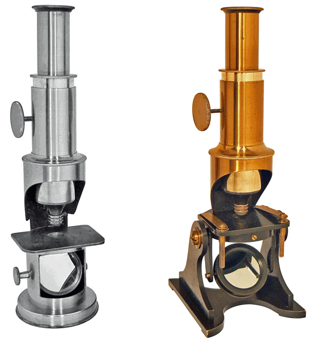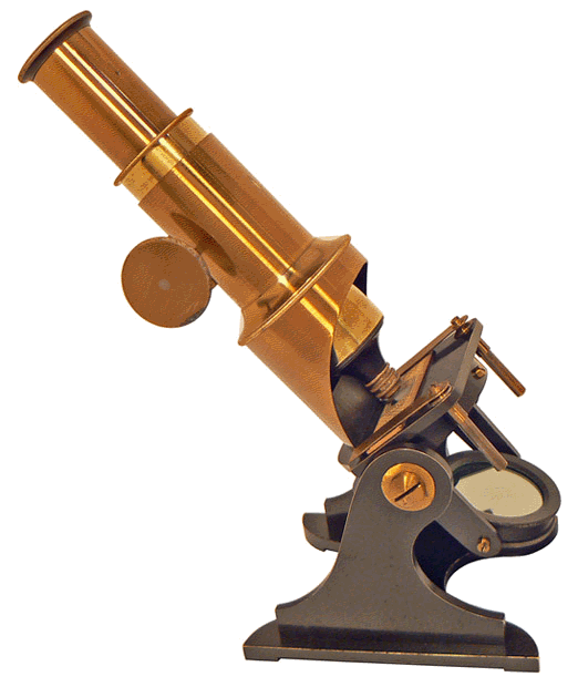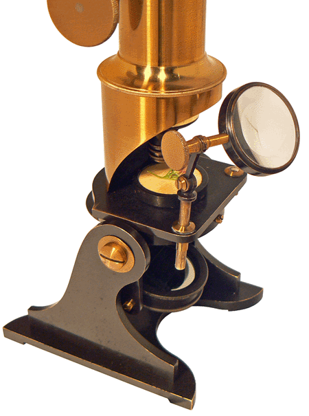 Notre microscope rappelle, dans sa partie supérieure, l'instrument photographié en noir et blanc, c'est-à-dire un microscope à niche typiquement français et de même hauteur. On aurait remplacé la base en forme de niche par un pied plus élégant, semblable à celui d'un microscope anglais ... L'ensemble, hybride, gagne en stabilité et il devient possible d'incliner le tube optique. Mais on remarque que le miroir a conservé son unique axe de rotation, ce qui est peu commode dans la recherche d'un l'éclairage optimum. |